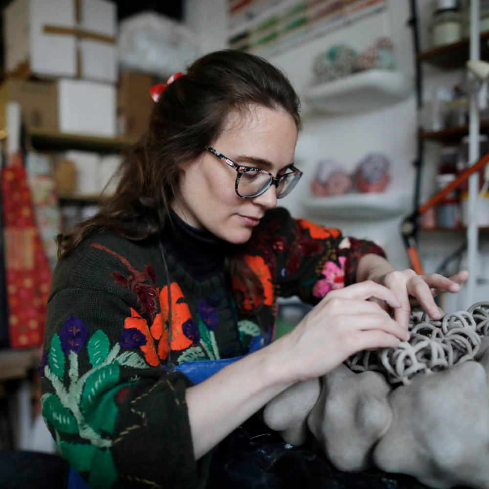 Tessa Eastman was born in 1984 in London where she continues to live and work. Creativity and innovation sit at the heart of her practice and collectors are drawn to the originality, skill and the daring approach she brings to ceramic art. Building pieces by hand, she draws inspiration from form as seen through a microscope or in the sea and sky. She explores strangeness of growth where systems flow and digress. Eastman’s playful aesthetic lends itself to the abstract cloud-like formations or curiously ambiguous sea-like creatures that appear to inhabit her work. The artist creates uncanny pieces where idiosyncratic shape, the combination of solid and open forms, bulbous and interlaced, accretive and geometric, weighs with the attention she gives to surface. Coarse and smooth, soft and glossy, pristine and weathered textures are presented, following research into glaze science. Eastman’s studio is at Cockpit, a community of leading craftspeople. She graduated from the University of Westminster (2006) with a Ceramics BA Hons, and gained a Ceramics MA (2015) from The RCA. She has been working with clay since age six and she has been exhibiting internationally since 2006.