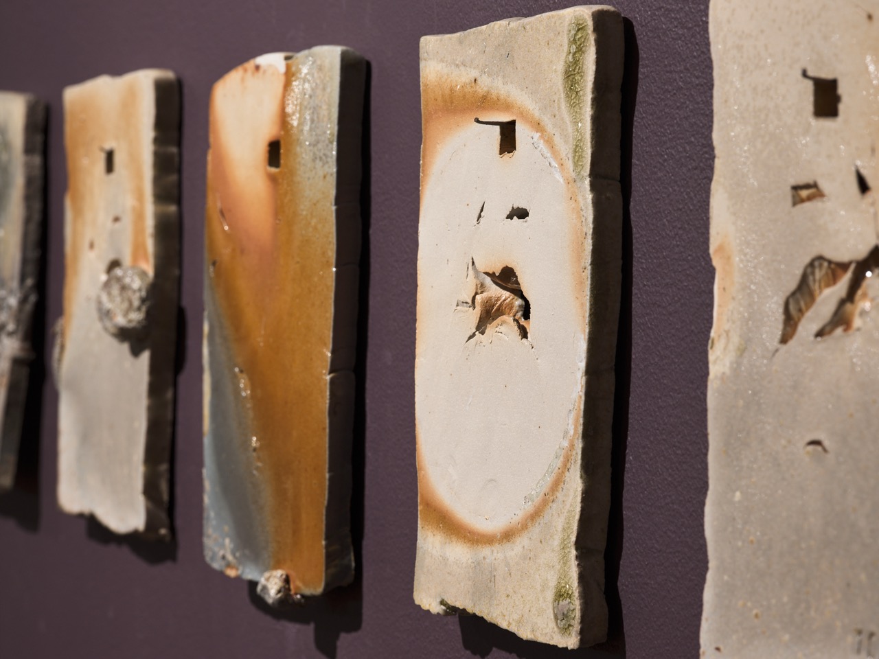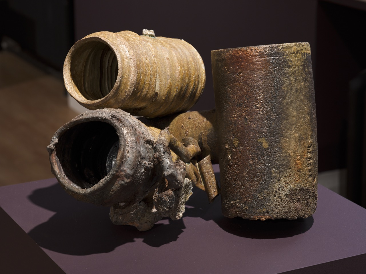 Clay work freshly out of an anagama kiln, no glaze just ash and clay