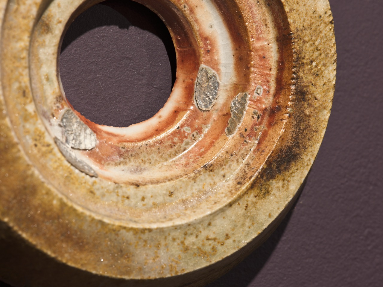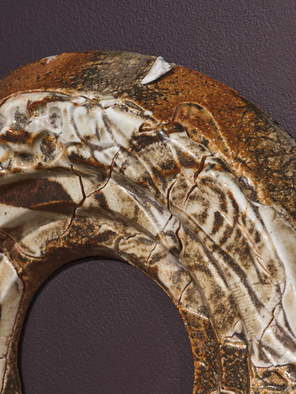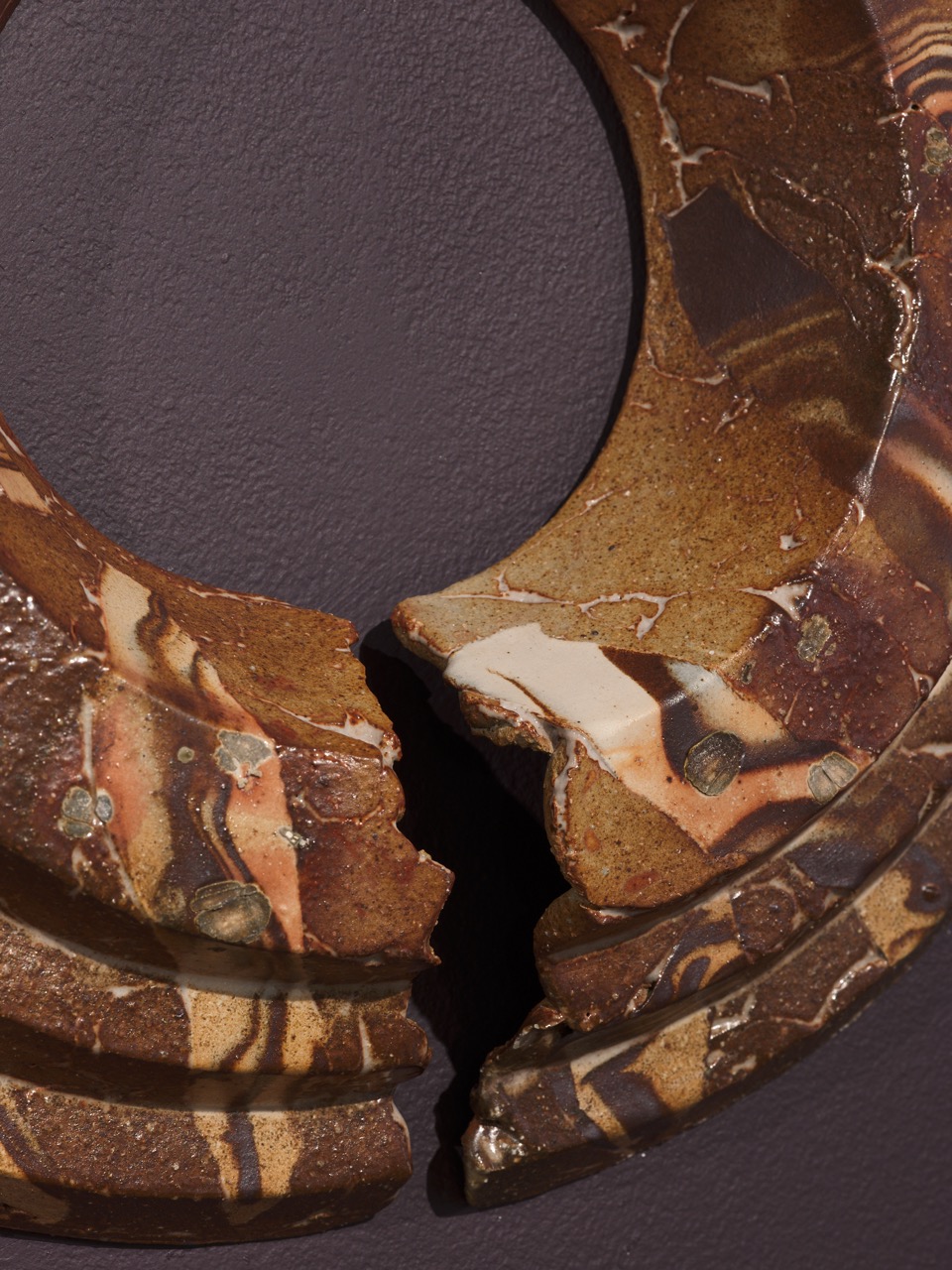 It has been crucial for me to use a blend of two distinct clays from different sources. By combining clays, tearing them apart, and applying pressure, my intention was to tangibly convey the fusion of different spaces and eras. The resulting object serves as a testament to the physical embodiment of compressed materials and ideas, intricately layered upon one other. I am making the layering of time and place not only visible, but a physical tension in its composition. While I am mixing the clay I am looking closely, accentuating the stretching in particular areas until I am content with the composition of each surface. I like to think of these slabs as portals, windows or maybe even tears in space. I create works that aspire to delight myself and the viewer’s curiosity, reminding us that no layer is the same in the process of discovery.
