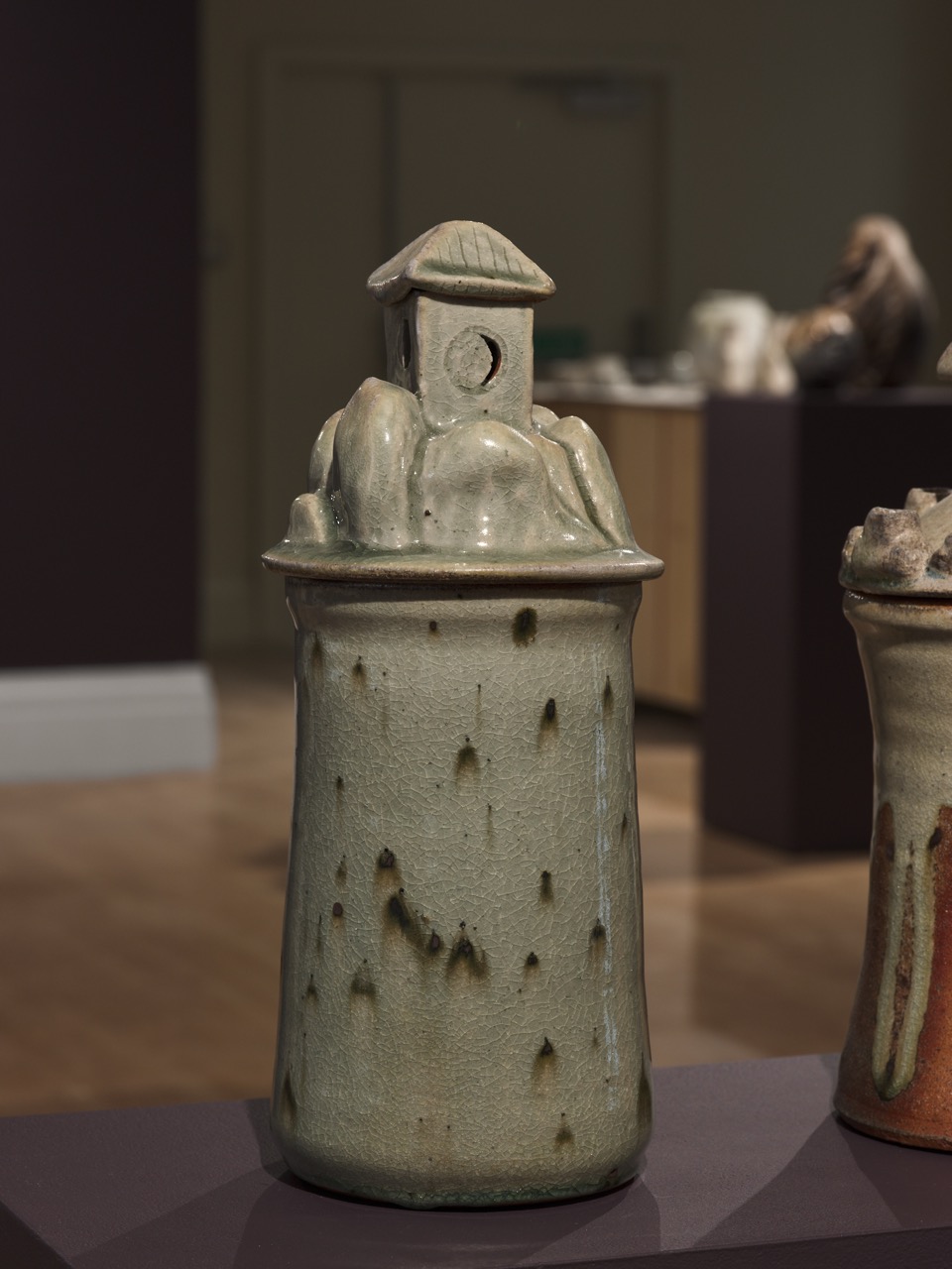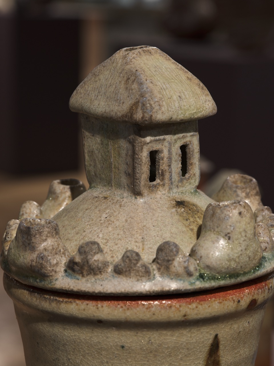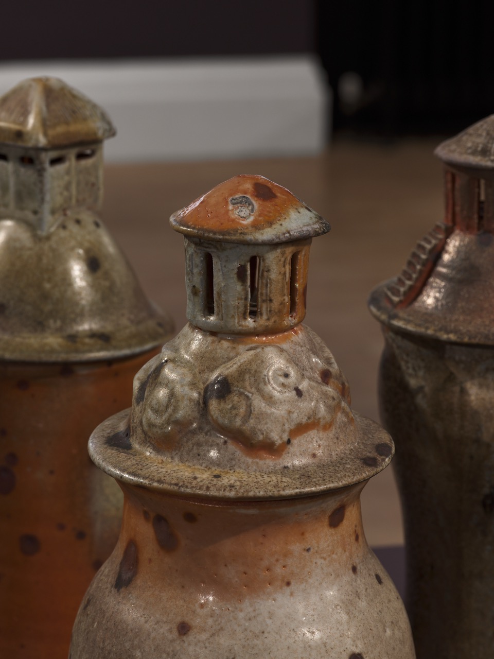 The group of vessels are ritual vessels to as yet unassigned rites. They have the function of a vessel with all those connotations and the lid for all of them has a house as its finial. The house itself is a vessel as well, symbolically and literally. It is for burning incense. The roof is removed and an incense cone is placed inside and lighted. The smoke comes out of the chimney giving life to that small image of the domestic, a home not just a house. One of the vessels has 4 candle holders on the lid too; another potential for ritual. These vessels are bestowers of ritual, giving ritual significance to the contents of the vessel, whatever that may be, as the smoke sanctifies and formalises the storage of these contents with the multitude of sensory associations with rite. They are a further exploration of my ethos where I hope to make objects to bring joy to the every day, giving significance to daily rituals and drawing attention to the beauty of the quotidian. They are special but rooted firmly in the domestic, with the house being the central symbol.