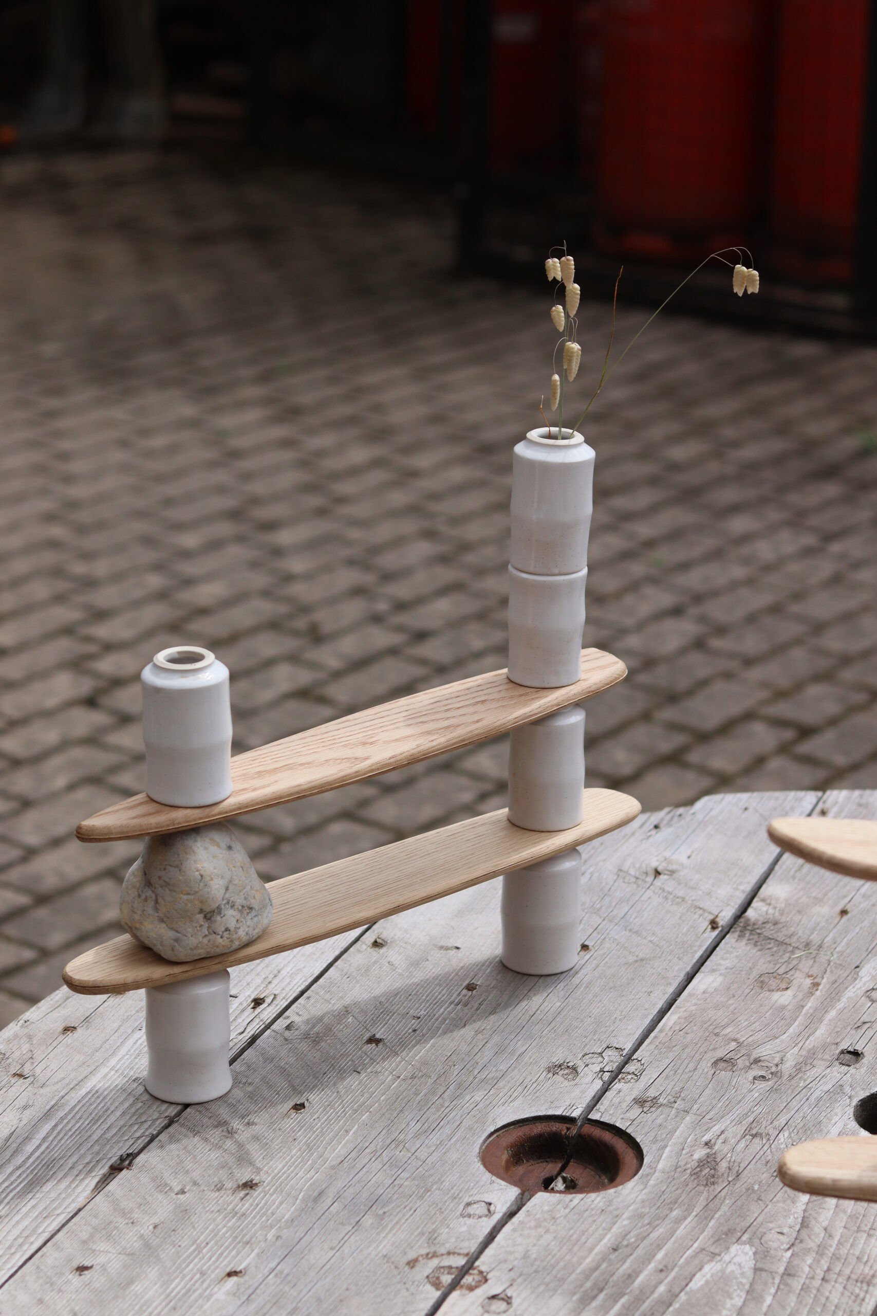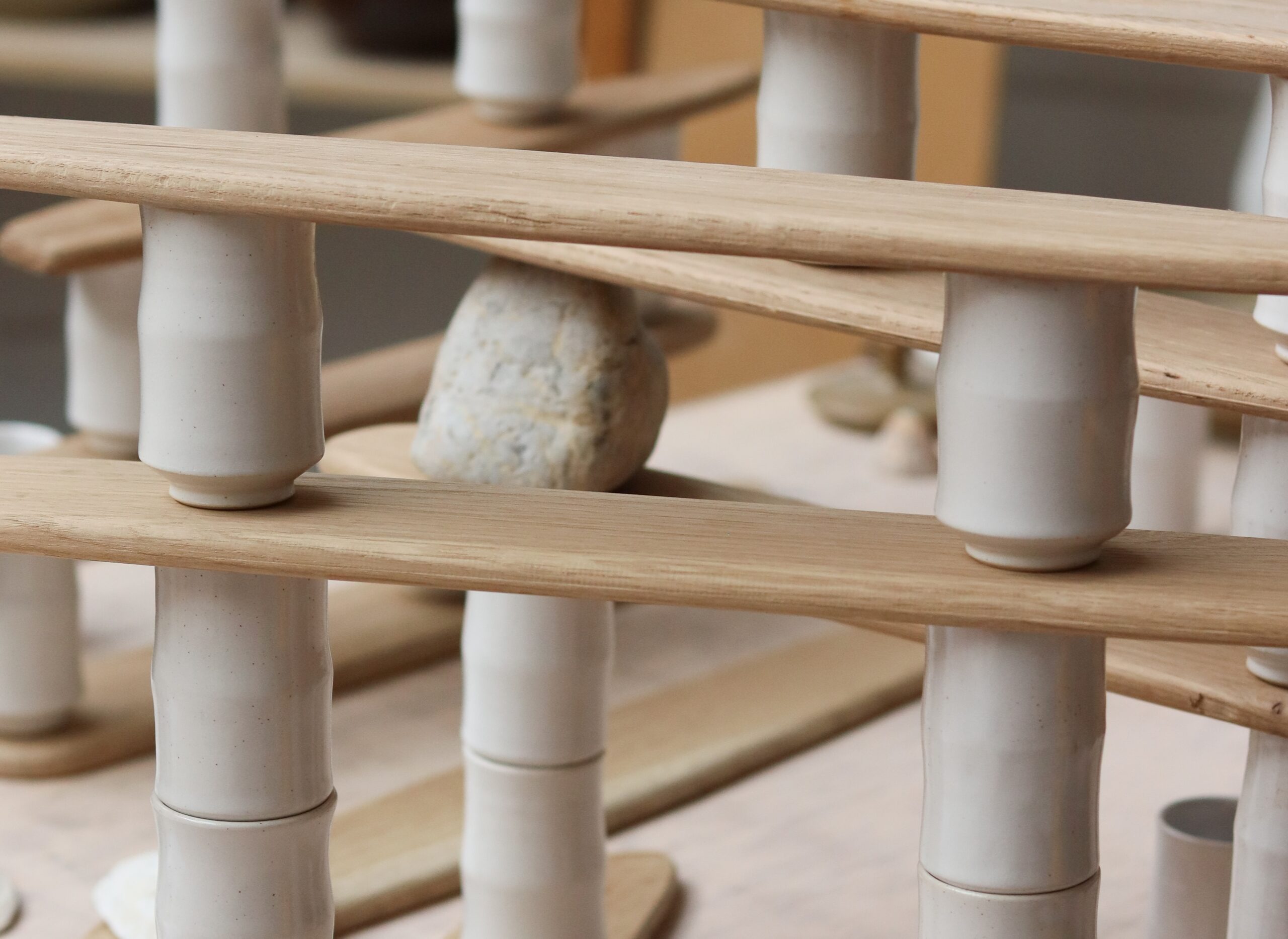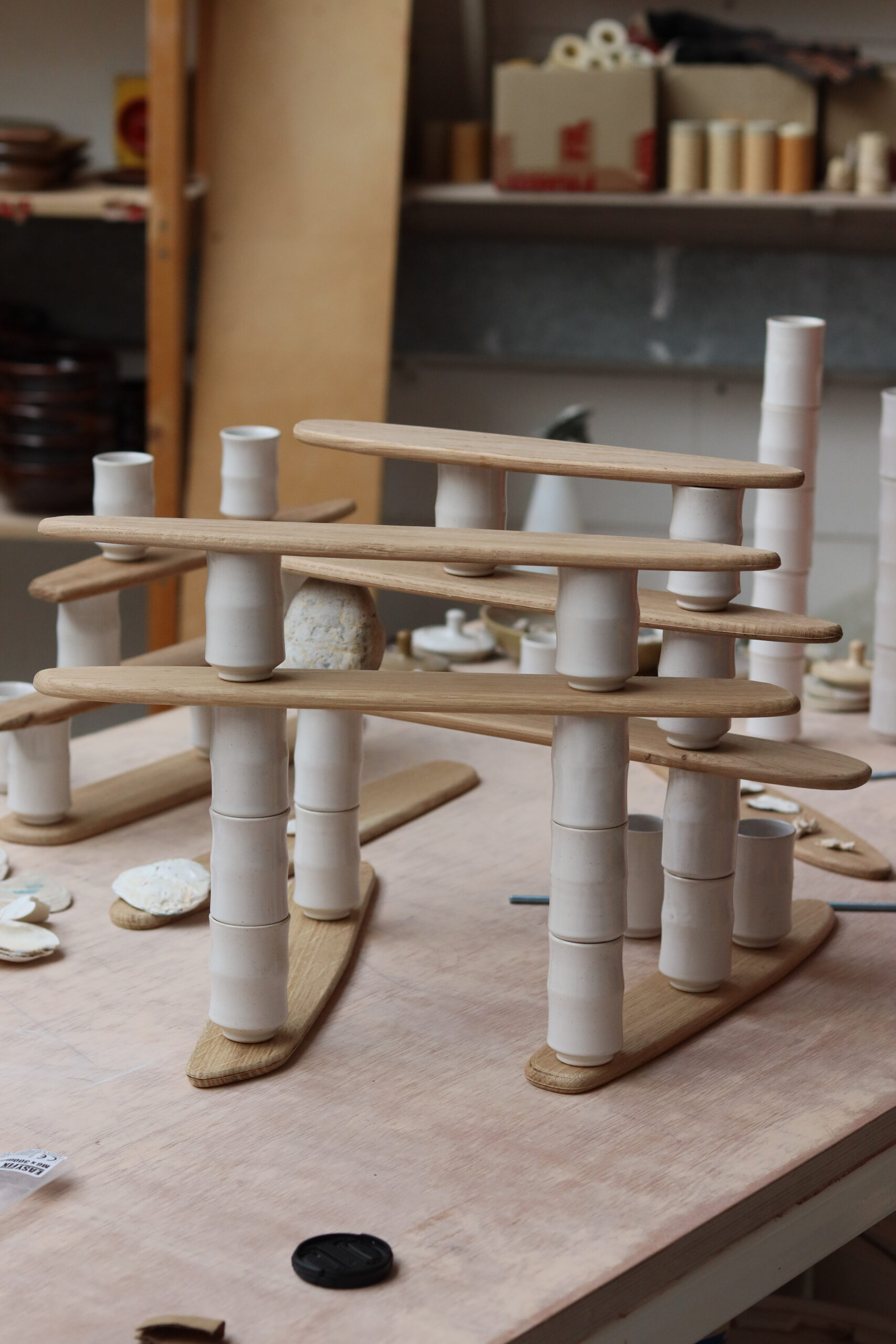 We took as a starting point some vessels we had been making in the studio for our glaze tests (image added above for info) and decided to make and fire a series of stackable versions, all glazed in white – a skeletal spinal column if you like – of uprights. Blades of oak, cut and sanded to an organic shape, like blades of grass, or equally, blades of a propeller.