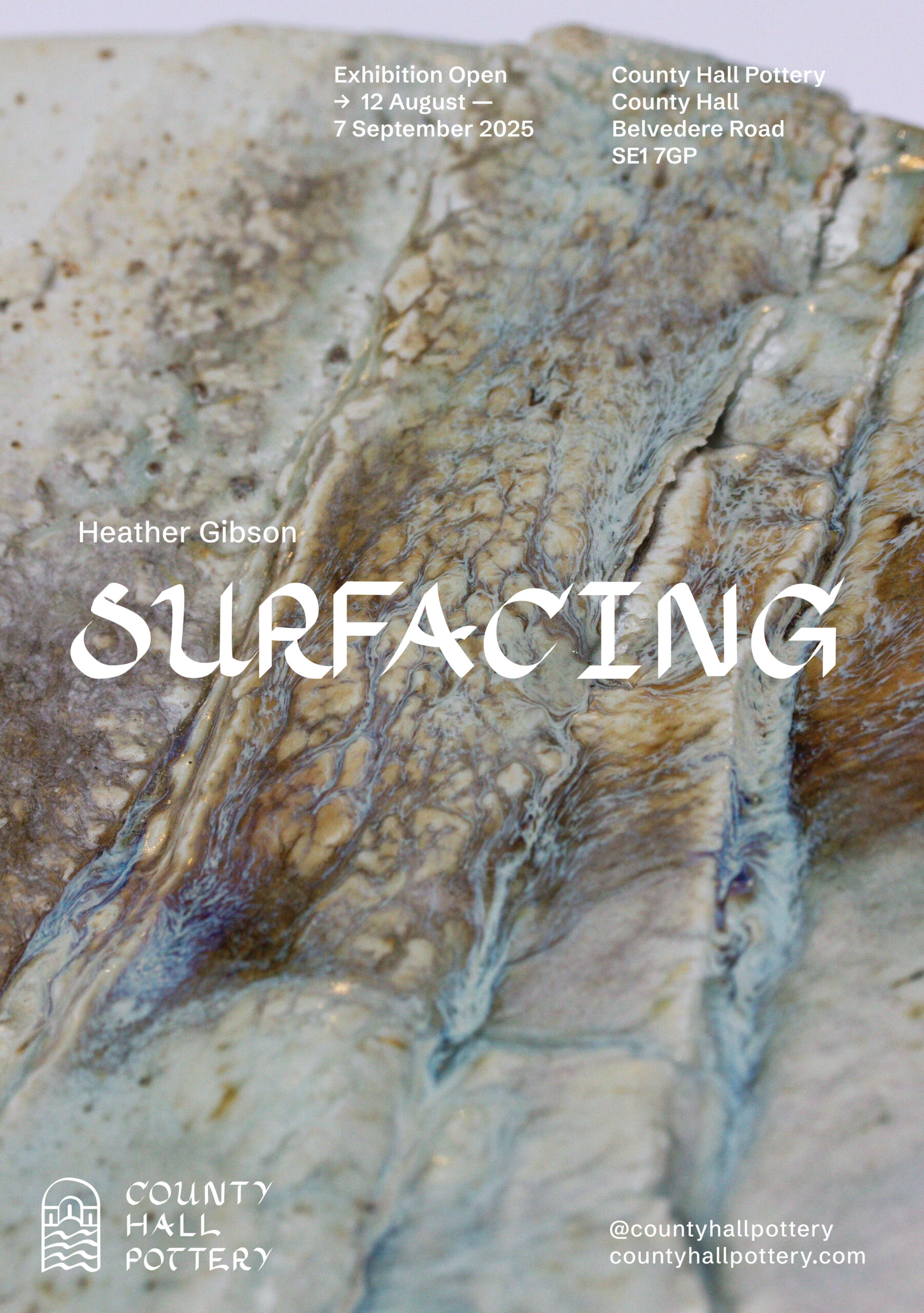 Past exhibitions Surfacing12 August -7 September 2025 After Ash8 July – 3 Aug 2025 Groundworks12 May – 29 June 2025 Edgelands18 March – 4 May 2025 Narratives in Clay28 January – 9 March 2025 Feast18 November – 5 January 2025 Formations in Clay Furniture14 September – 10 November 2024 Metamorphic1 July – 8 September 2024 Beyond The Kiln13 May – 30 June 2024 County Hall PotteryCounty HallBelvedere RoadSE1 7GP During exhibitions,the gallery is open:Tuesday to Sunday11am - 6pmClosed 1 - 1:30 AboutClassesGalleryStudioShopContact Contactgallery@countyhallpottery.comInstagramFacebookYoutube Privacy Policy